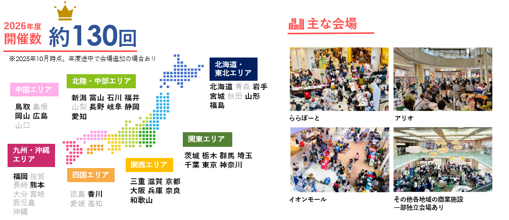 商業施設を中⼼に累計350回開催・65万人にご来場いただき、13年目になります。